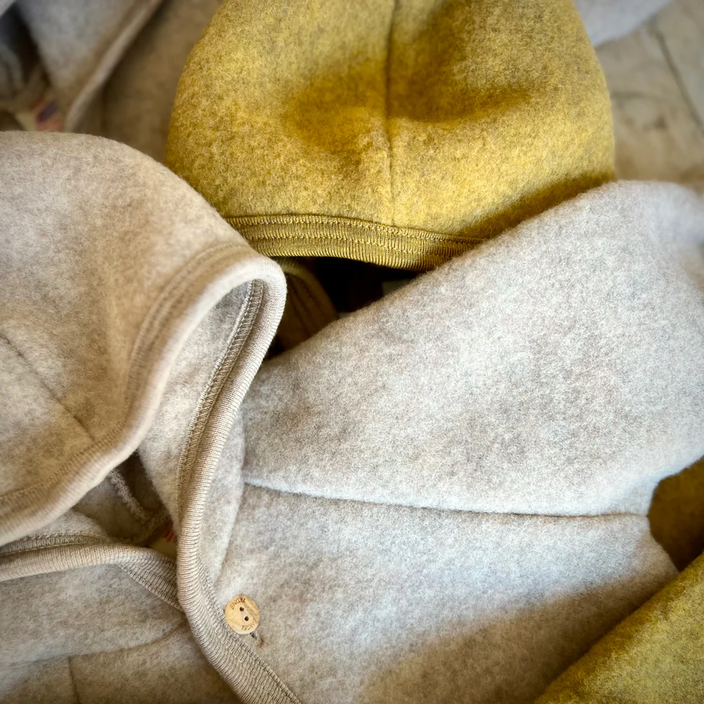 The most comfortable hooded jacket in the softest organic merino wool fleece. Wooden button opening at front. A great mid season jacket and also as a layer under rainwear or other jackets. This quality is dirt and water repellant thanks to the lanolin concentration of the wool and regenerates through airing, frequent washing is therefore unnecessary.
