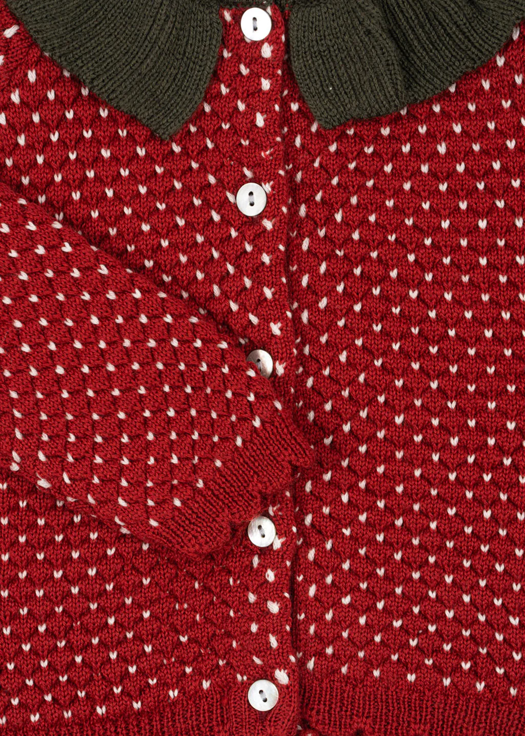 Warm and soft cardigan finished in a structured knit pattern. Designed with a rounded collar and ribbed scallop endings. Closes with mother of pearl buttons.