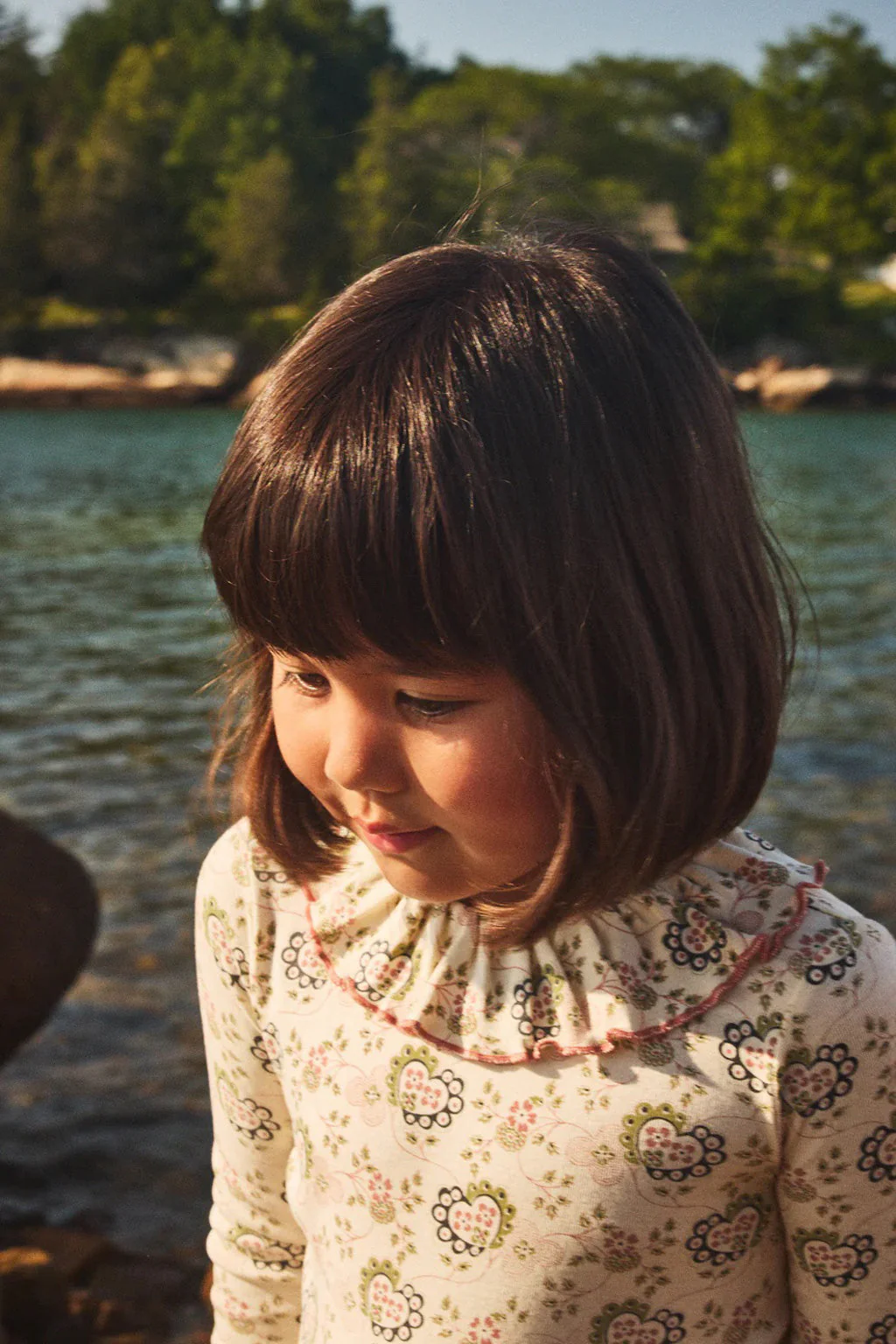 A long-sleeved slim-fit top in soft organic Pima cotton, featuring a gathered ruffle neck with contrast merrowed edge and snap closure at the back neck.