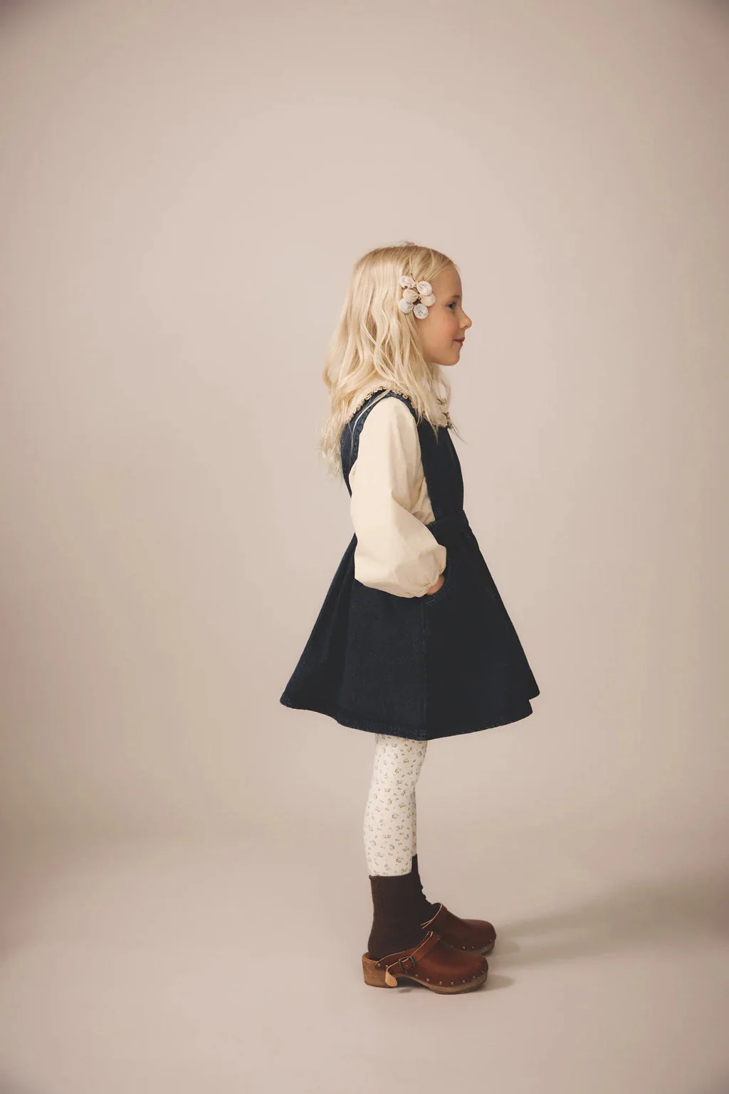 Soor Ploom's retro pinafore with bibbed bodice and A-line skirt. Double, antique brass snap closure at shoulder. Elastic at back waist with pockets at sides. Falls above the knee.